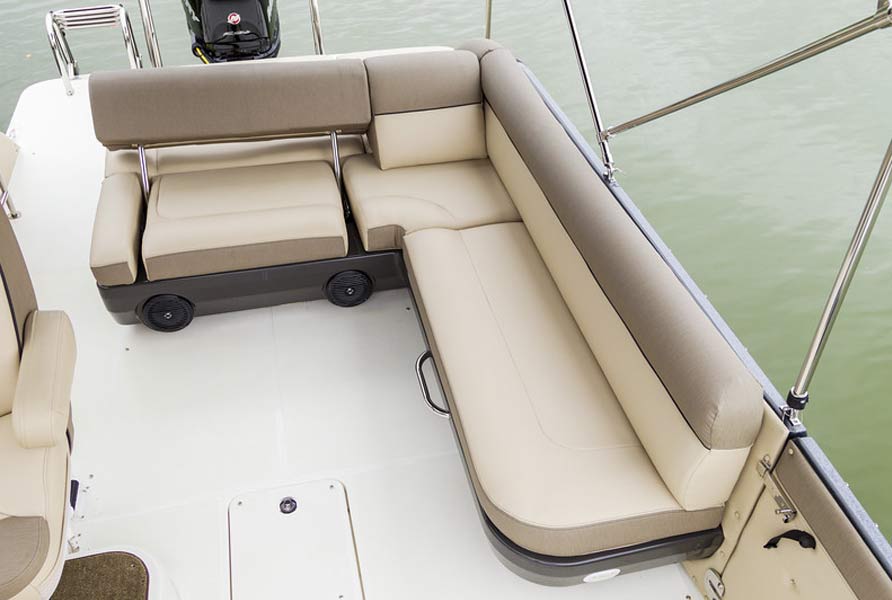 - Spacious deck layout with plush, premium-upholstered lounges forward and aft, companion and captain's helm seat. Deep freeboard and high gunnels keep passengers and gear secure with outstanding capacity for up to 16 passengers.